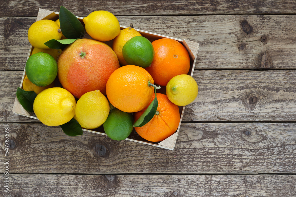 Mix of citrus fruits. Oranges, grapefruit, lemons and limes with leaves in box on wooden background. Top view. Photo from above.