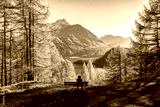 Silhouette of a person on a bench who is enjoying the view of the golden larch trees near Lake Sils. Engadin valley in Graubünden canton, Switzerland.