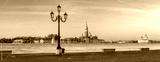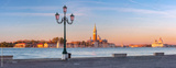 Panoramic view of San Giorgio Maggiore at sunrise with famous pink street lamp, Venice, Italy