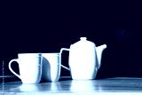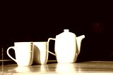 Two white ceramic or porcelain tea cups and tea or coffee kettle pot stand on a wooden table at sunny morning in a kitchen. White kitchen dishware. White ware on dark black background. Selective focus
