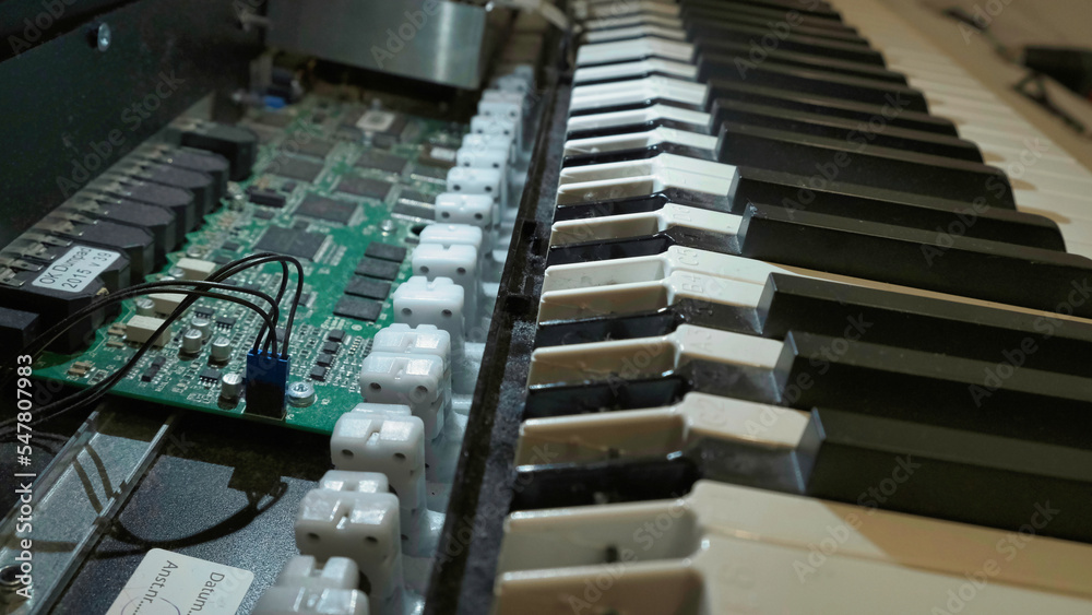 Cleaning dirty old synthesizer keys. Disassembly and keyboard repair. Keybed close up shot.