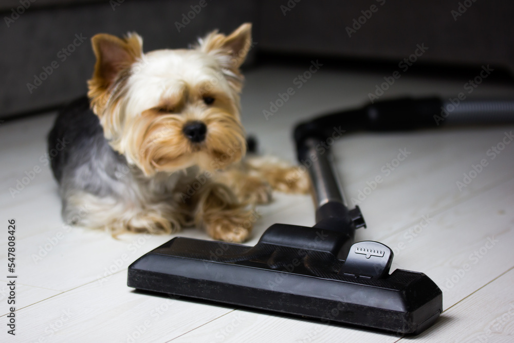 Yorkshire Terrier dog lying on white parquet floor near vacuum cleaner. Cleaning