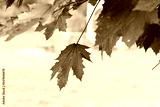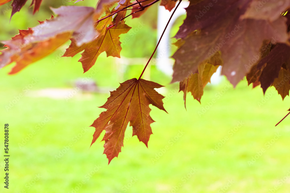 Red maple leaves on tree branch on green background. Autumn wood, park, forest.