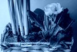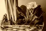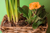Basket with spring bulbous plants, yellow Primula vulgaris flowers growing.