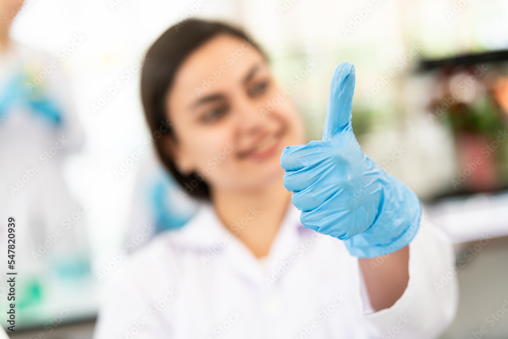 success happy news lab researcher doing thumbs up with medical gloves. happy and positive, thumb up doing excellent and approval sign.