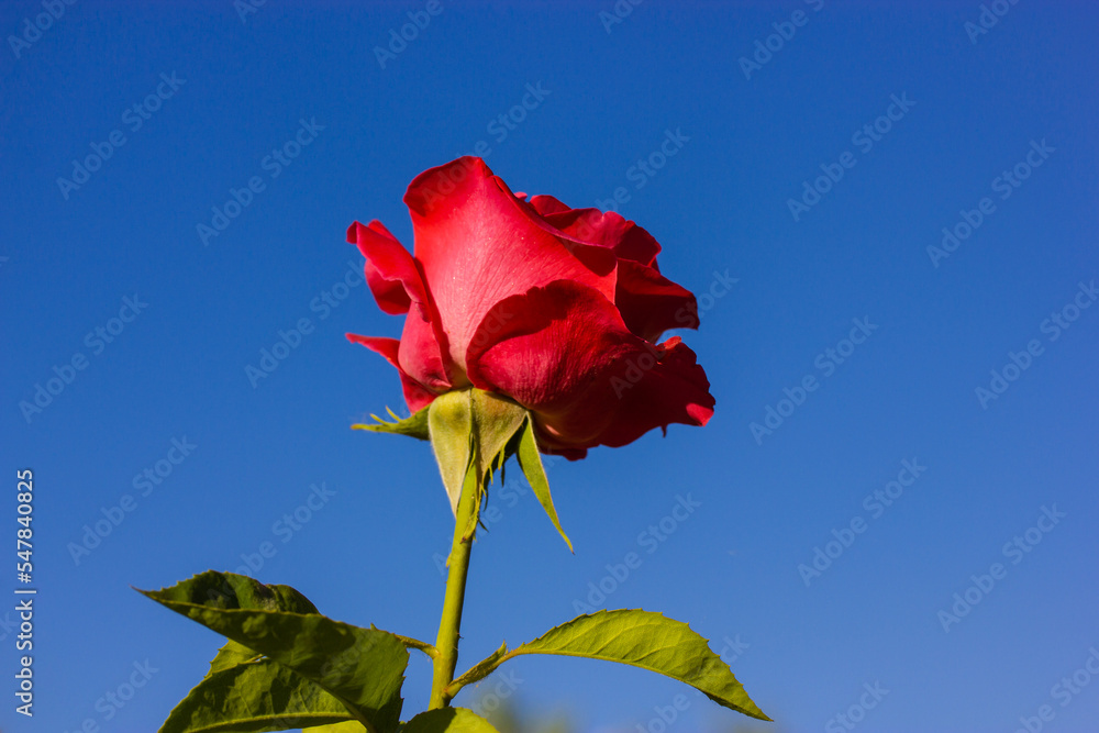 Beautiful red rose isolated against clear blue sky in summer botanical garden.