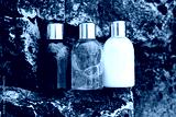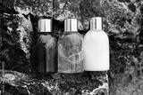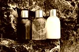 Travel kit. Cosmetic products set in travel containers against rocky cliff backdrop. Natural face body skin care products. Shampoo shower gel lotion against stone background. Stylish cosmetic bottles.