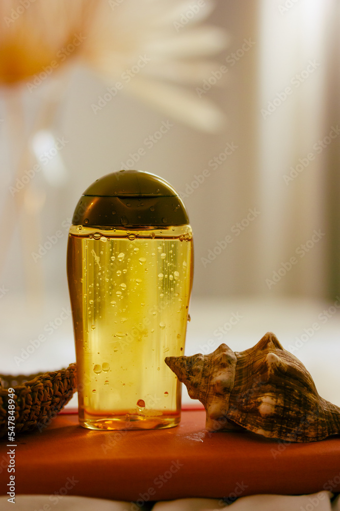 Suntan oil bottle on beige background. Sunblock cosmetics. Natural SPF sunscreen