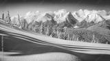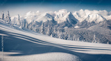 Untouched winter landscape. Snowy winter scene of mountain valley with fir trees covered by fresh snow in Carpathian mountains. Bright winter landscape of snowy valley.