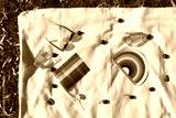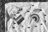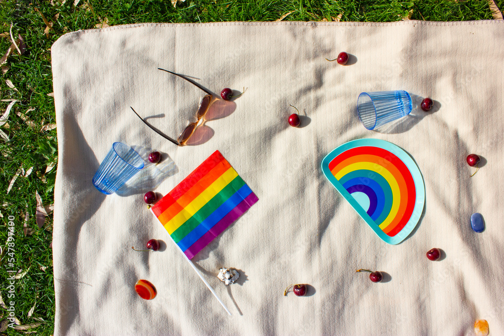 LGBTQ picnic in summer park. Pplaid on grass, pride month. LGBT flag, dishes.