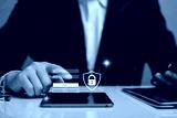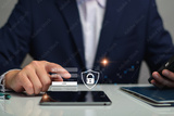 Cyber security concept. Businessman login access business sensitive information, data security, secure company internet network, hack protection, fingerprint scanner, cyber space, business security