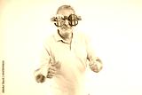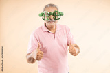 Cheerful crazy senior old man wearing dollar shape funky eyeglasses and doing doing thumbs up with both his hands, Retirement life, Success in business.