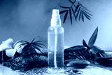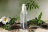 Wet bottle of micellar water, leaves, flower and spa stones against green background