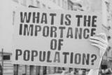 The question " What is the importance of population? " is on a banner in men's hands with blurred background. Future. Money. Prediction. Citizen. Career. Data. Directional. Generation. Evolution. Rise