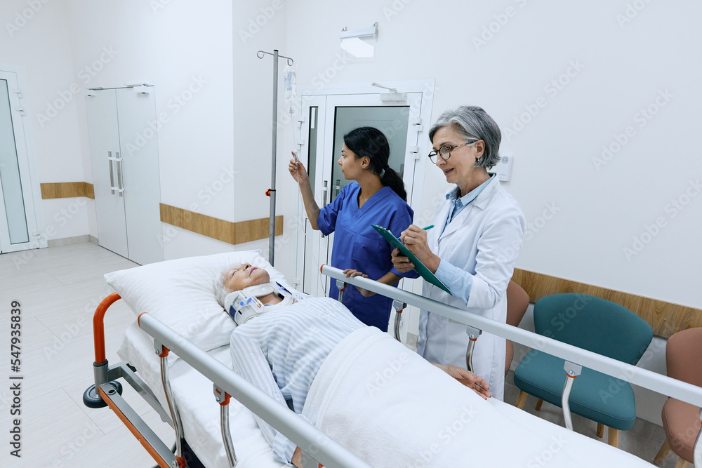 Doctor examining elderly patient with neck injury lying on medical gurney with cervical collar in hospital corridor, taken by ambulance