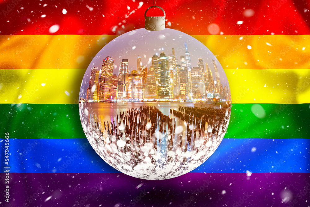 New York City skyline glass christmass ball on LGBTQ flag