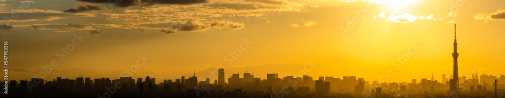 Ultra wide image of silhouette of Tokyo skyscrapers and Tokyo skytree on sunset orange sky.