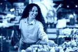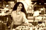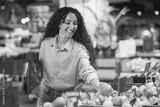 Happy woman buyer in supermarket, Latin American woman buys apples, fruits and vegetables, puts in an ecological bag.