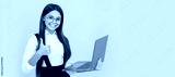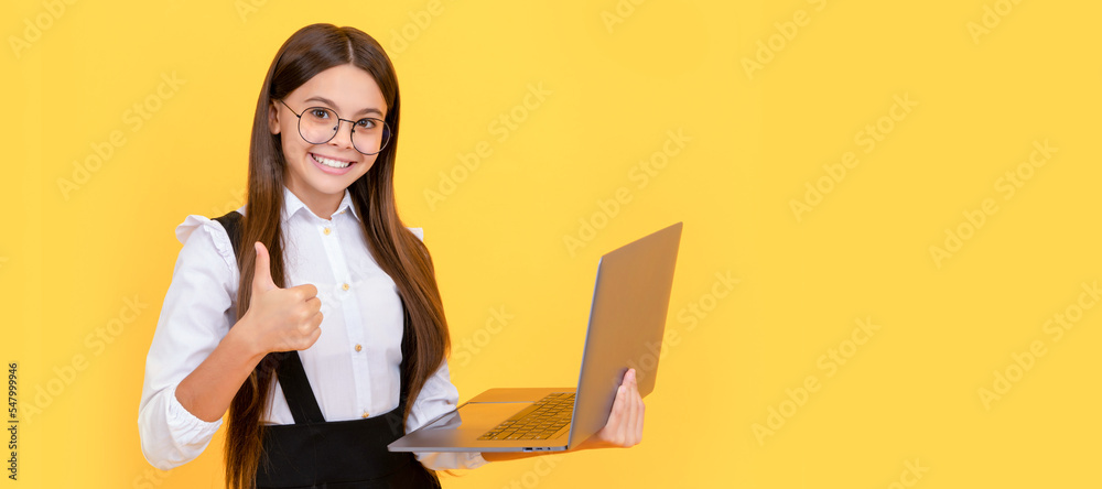 typing school blog. impact of computer on vision. kid in glasses. girl use laptop for communication. School girl portrait with laptop, horizontal poster. Banner header with copy space.