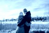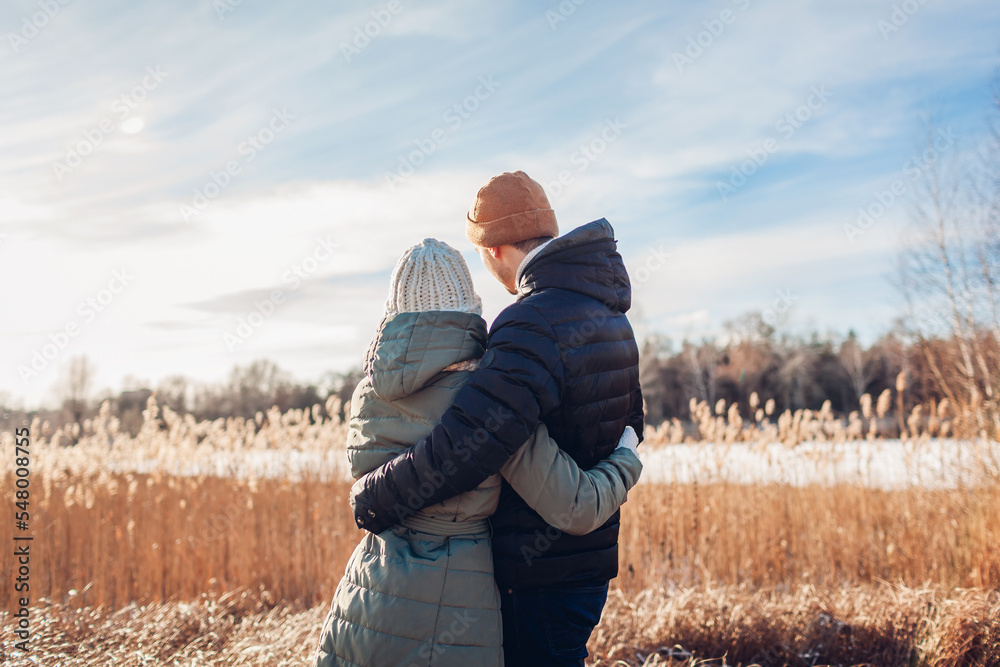 Back view of loving couple walking by winter river. Man and woman hugging enjoying snowy landscape outdoors