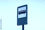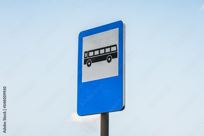Close-up to a blue and white rectangular bus stop sign against clear sky