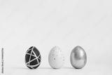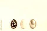 Three Easter golden decorated eggs on white background. Minimal easter concept. Happy Easter card with copy space for text. Top view, flatlay.