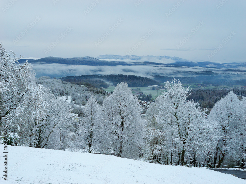Wonderful view of green valley surrounded with hilltops covered with fresh snow