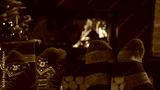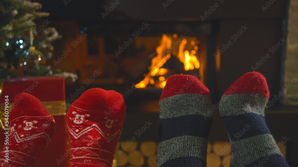 CLOSE UP: Couple wears Christmas socks on their feet and relax by fireplace
