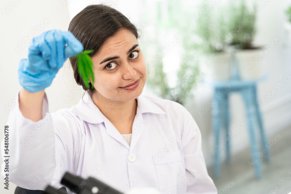 Scientist holding a withered marijuana leaf