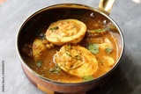 Egg Curry or Anda masala gravy, baida curry. Indian spicy food. Indian nonvegetarian Homemade food. Perfect Indian lunch. over moody background with copy space.