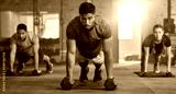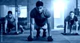 Group exercise in gym, people training body with focus mindset and sweat in cross fit class together. Healthy lifestyle in fitness club, floor workout with personal trainer and challenge energy
