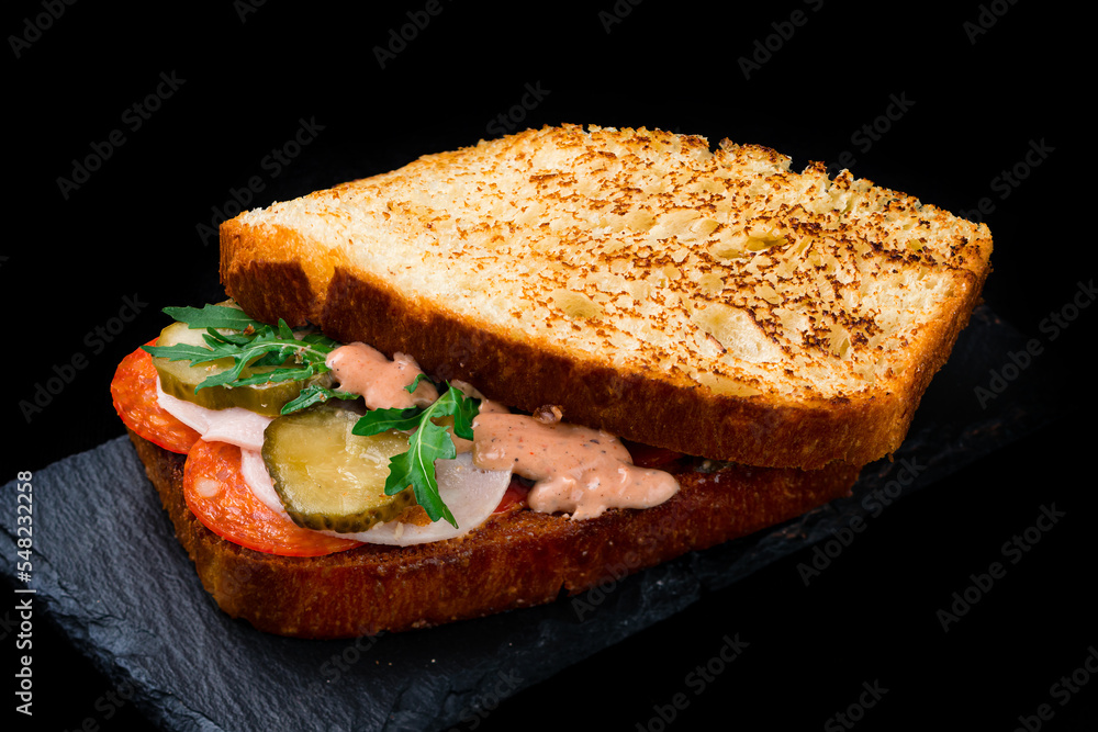 Fried sandwich with salami, pickles, ham, arugula and sauce.