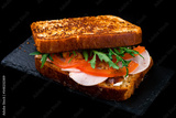 Fried sandwich with ham, tomatoes, arugula and sauce.
