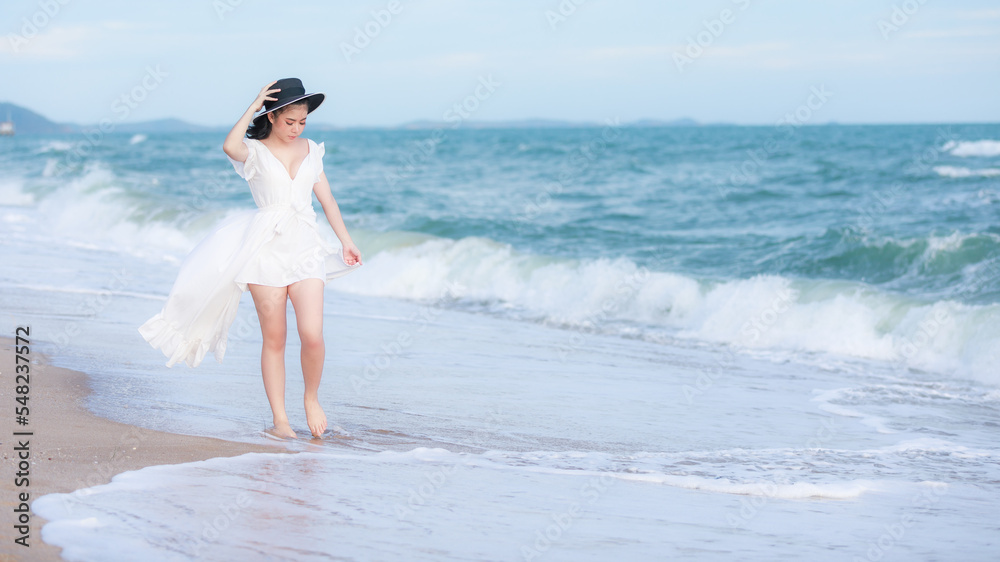 Young asian woman wearing white dress and black hat walking relax on the beach, enjoying the sea and Happy summer vacation
