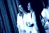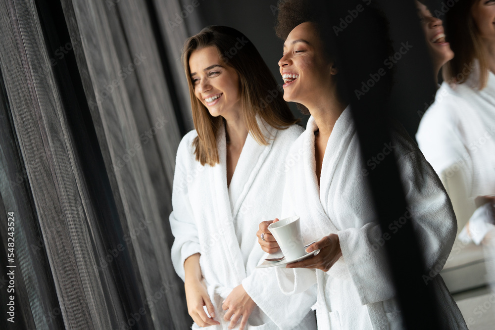 Attractive happy young women drinking coffee at spa center