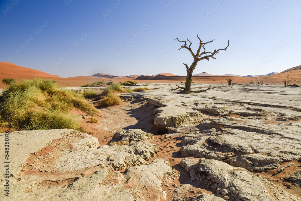 Camelthorn trees at Deadvlei, Sossusvlei, Namibia. They were formed when the area flooded allowing the trees to grow, but sand dunes blocked the river, cutting off all water.