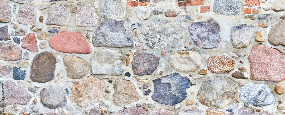 Rustic natural stone wall in panorama format.
