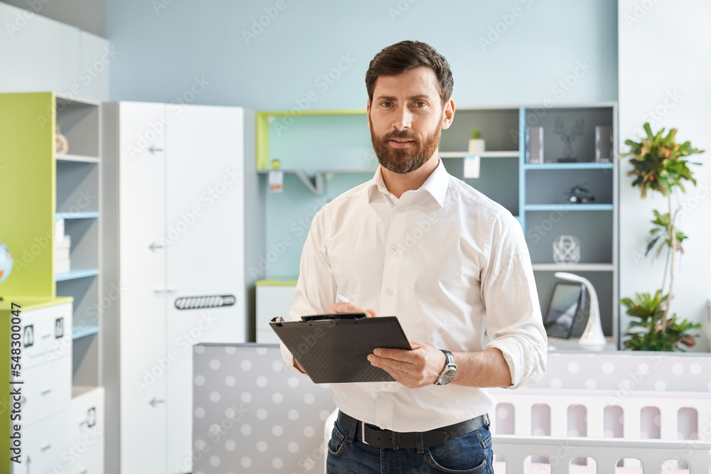 Handsome salesman with black tablet looking at camera, while standing in showroom. Portrait of attractive male retailer in shirt making notes, while working in furniture store. Concept of workplace.