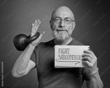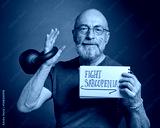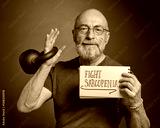 fight sarcopenia, muscle loss due to aging - inspirational message in a notebook held by a senior man (in late 60s) exercising with iron kettlebell, active senior and fitness concept