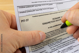 Pit 37 form, annual tax return form for individuals in Poland, Hand with a pen filling out a document for the tax office