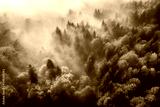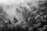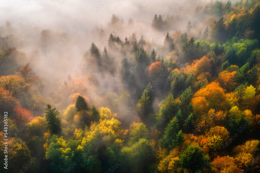 Aerial view of beautiful colorful autumn forest in low clouds at sunrise. Top view of orange and green trees in fog at dawn in fall. View from above of woods. Nature background. Multicolored leaves