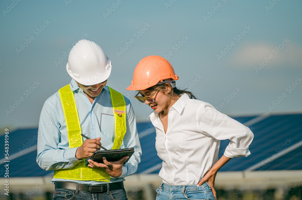 Asian Young Inspector Engineer man and female colleague checking operation in solar farm