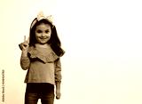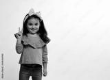 Happy beautiful girl showing peace v-signs and having fun, laughing and smiling at camera, standing against white background copy space