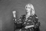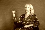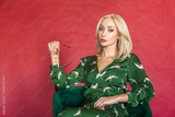 Beautiful blonde woman in green dress with makeup and eye glasses in her hand on red studio wall background