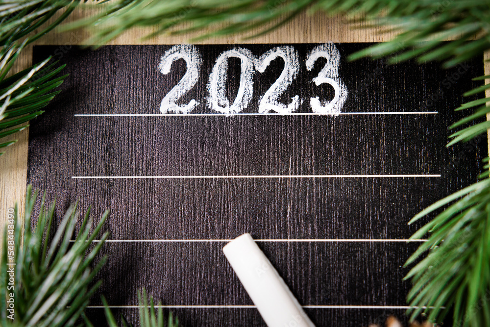 List mockup with items for 2023, template with copy space and Christmas tree, flat lay.