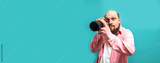 Crazy emotions. Young funny hipster tourist looking through a spyglass and considering the sights isolated on studio background. Looking for discounts, sale, seasonal sales. Colorful summer concept.