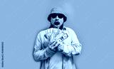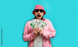 Excited happy young male winner feeling joy while holding money won, winning lottery, placing bets, getting cashback online gift on blue background. Human face emotions and betting concept.