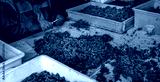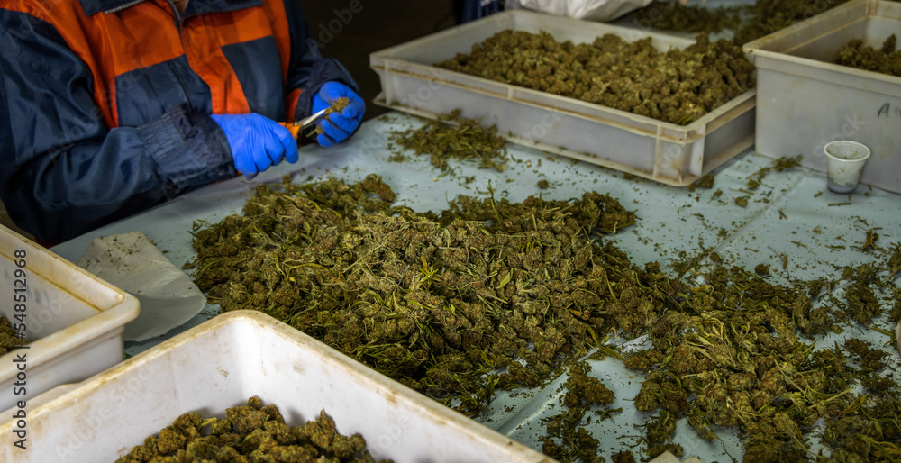 Female’s worker in gloves trimming with scissors marijuana leaves from dry buds
