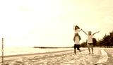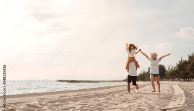 Happy asian family enjoy the sea beach at consisting father, mother and daughter having fun playing beach in summer vacation on the ocean beach. Happy family with vacations time lifestyle concept.