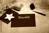 Wunschliste für Weihnachten mit Tinte, Füller und Weihnachtsdekoration.